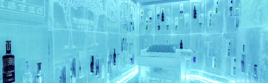 a fully carved ice room—walls, bar, even the glasses are frozen.
